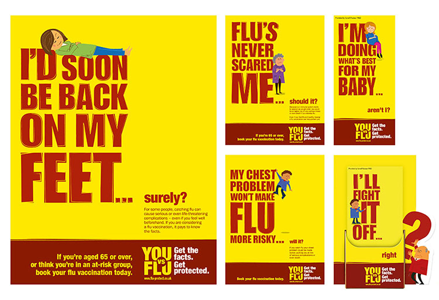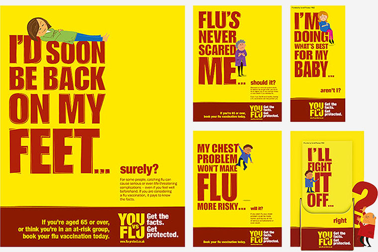 A much harder-hitting idea for this season's flu awareness campaign that tries to tackle common objections and misconceptions around flu and its potential danger. Still utilising the established illustration styles from last year and still with a huge spread of materials, this year's campaign is strictly for consumers with an all-new (and very different) campaign for professionals to follow.