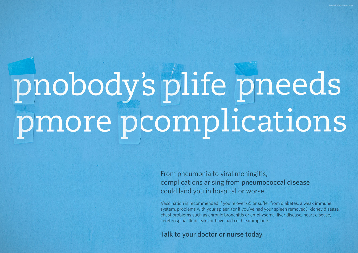 Sanofi Pastuer MSD's Flu campaign gets reimagined for 2013. This is a huge campaign that incorporates consumer and professional advertising. Lee and Spencer have had a mammoth task with these technically complicated and individually bespoke pieces. This should get noticed.